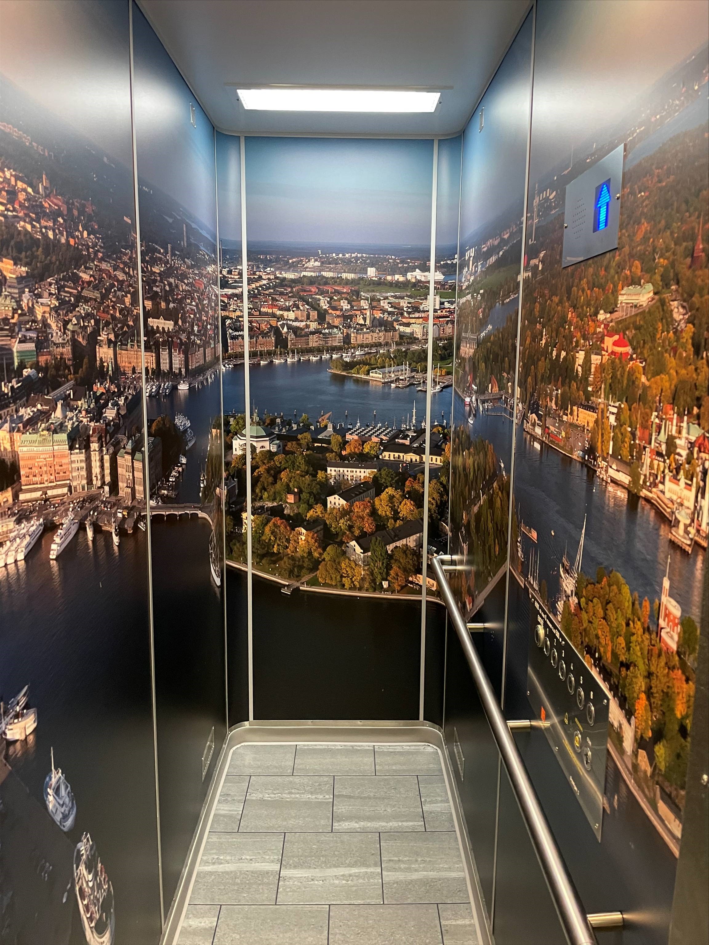 På Grytstigen 2–8 i Storvreten har hissarnas insida fått olika naturmotiv. Tanken är att även ljud som vågbrus och fågelkvitter ska installeras så småningom.