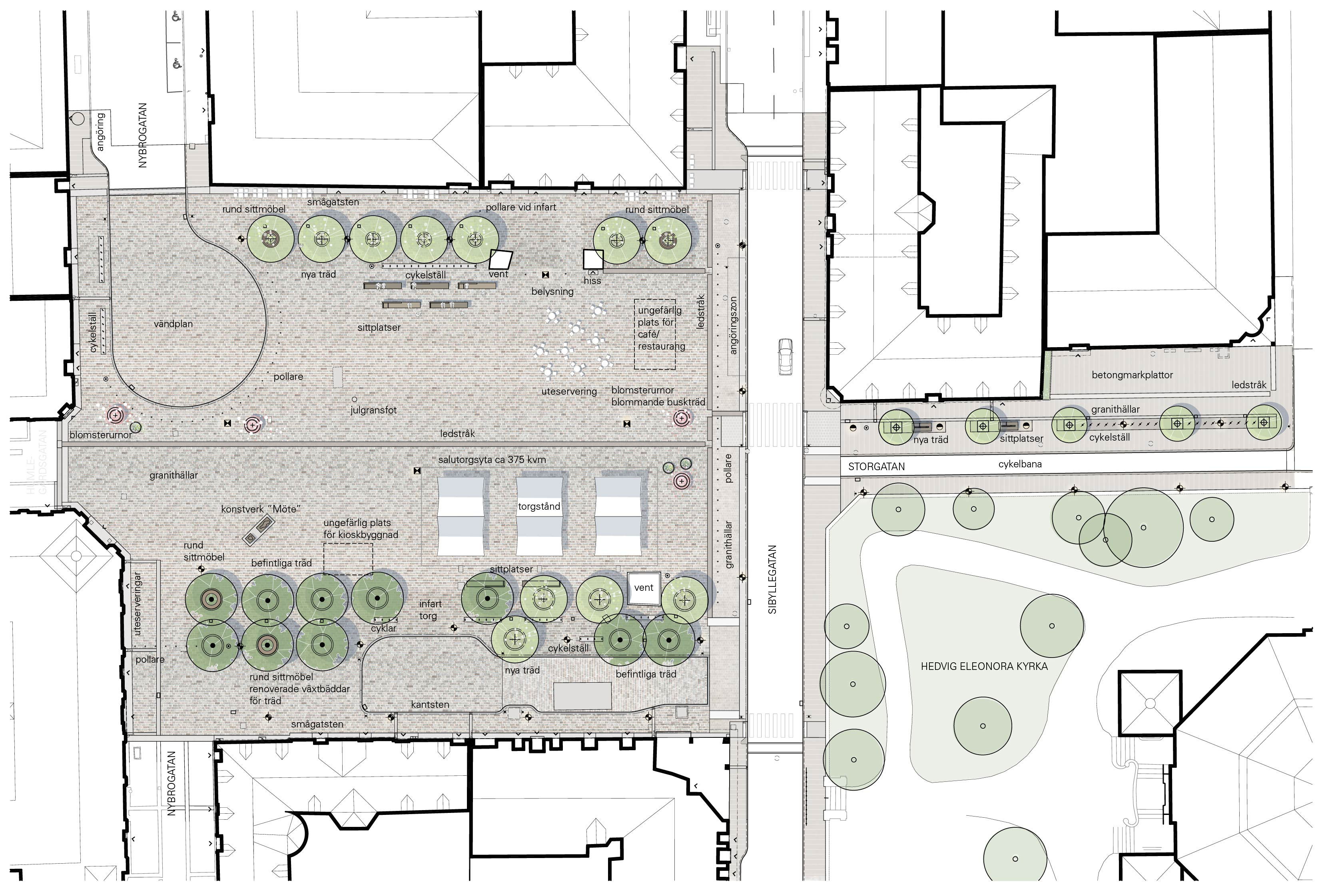 - Tio av de befintliga träden på södra sidan av torget bevaras och får renoverade växtbäddar. Tre av de befintliga träden kommer att behöva tas ned på grund av att de är skadade och för att möjliggöra framtida infart för räddningsfordon på torget.