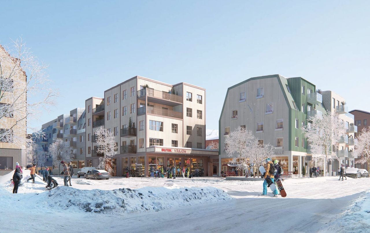 Torghusen vid Väsjö torg i Sollentuna. Pressbild: Hanssons Hus Entreprenad